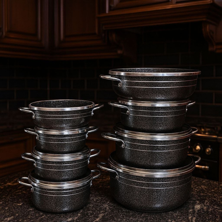 ۶ عدد قابلمه در سایز های ۱۴/۱۶/۱۸/۲۰/۲۴و ۲۸و دو عدد تابه دو دسته در سایزهای ۱۸ و ۲۸