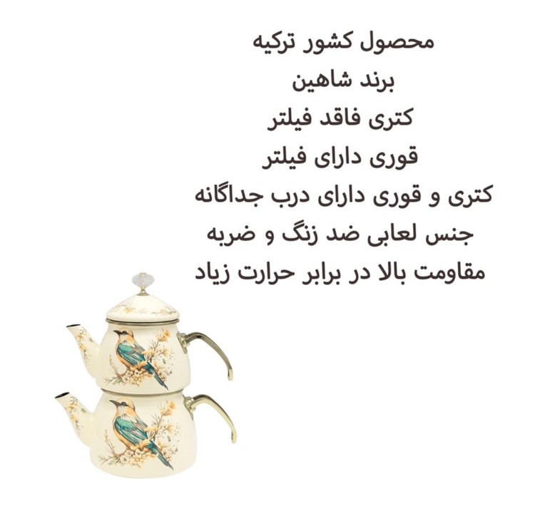 محصول کشور ترکیه _ برند شاهین _ کتری و قوری دارای درب جداگانه _ جنس لعاب ضد زنگ و ضد ضربه _ مقاومت در برابر حرارت زیاد: گنجایش کتری ۲.۱ و گنجایش قوری ۱.۱